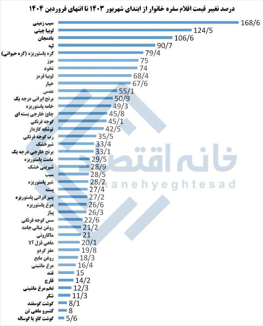 کانال تلگرامی «خانه اقتصاد» با انتشار نموداری نوشت: براساس دادههای مرکز آمار ایران، از ابتدای شهریور ۱۴۰۳ تا انتهای فروردین امسال برخی از اقلام سفره خانوار افزایش قیمت عجیبوغریبی داشتهاند.