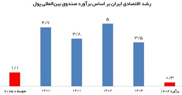 صندوق بینالمللی پول در جدیدترین گزارش خود از چشمانداز اقتصادی جهان پیشبینی کرد رشد اقتصادی ایران در سال جاری میلادی به ۰.۳ درصد برسد. در حالی که طبق اعلام صندوق بینالمللی پول، رشد اقتصادی ایران از محدوده میانگین یک درصد در دهه ۹۰ به سطح مطلوب بین ۴ تا ۵ درصد در دولت رئیسی افزایش یافته بود، هماکنون همین نهاد غربی پیشبینی کرده که در سال جاری رشد اقتصادی ایران به سمت صفر سقوط کند.