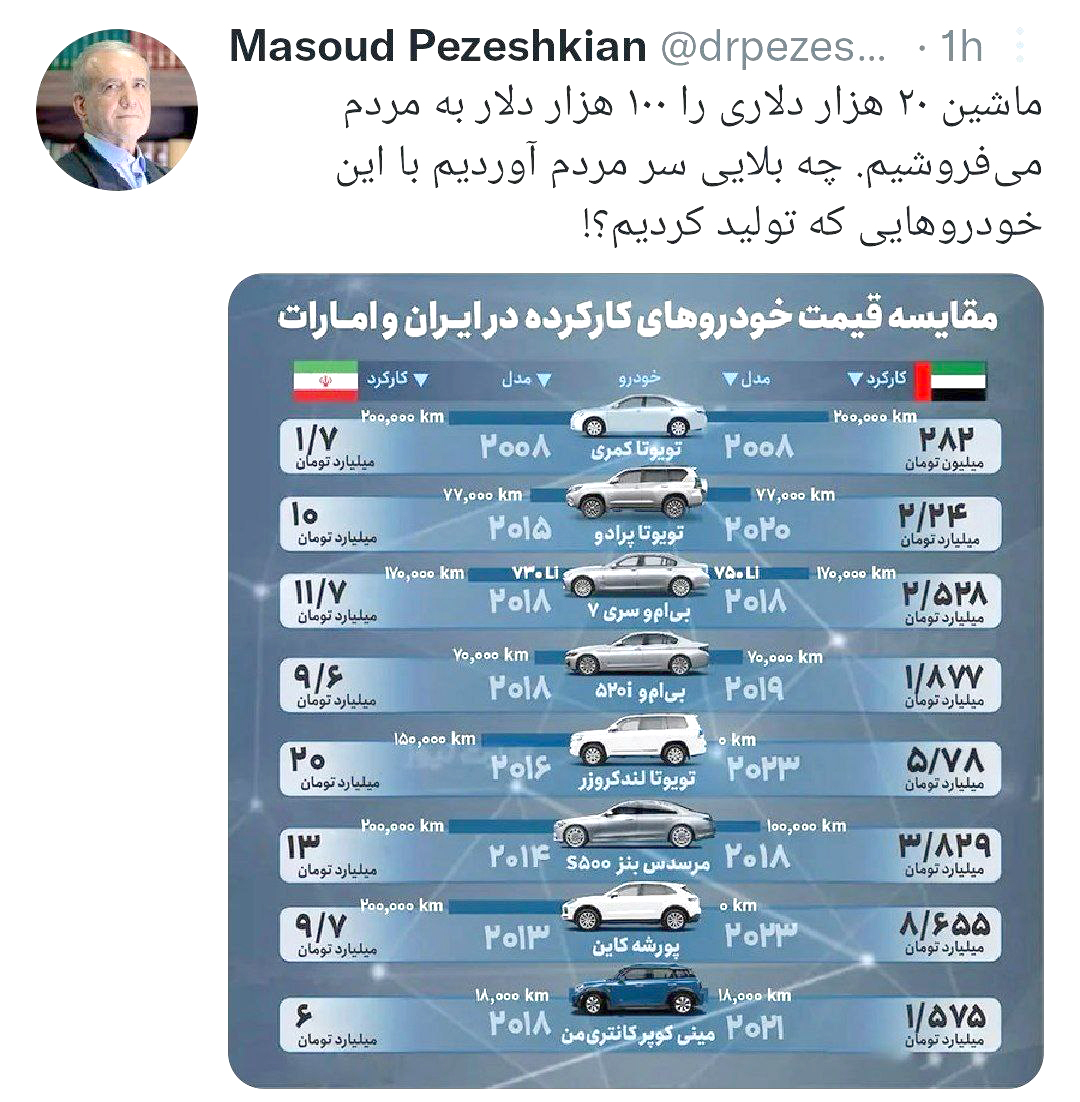 افزایش شدید قیمت خودرو در دولت پزشکیان در حالی رقم خورده که او در مناظرات انتخاباتی از گران بودن خودرو در ایران انتقاد میکرد. پزشکیان در زمان انتخابات در مورد قیمت بالای خودرو در ایران انتقاد کرده و گفته بود که خودروهایی که با قیمت ۲۰ هزار دلار تولید میشوند، با قیمت ۱۰۰ هزار دلار به مردم فروخته میشوند. وی معتقد بود که این قیمتها بسیار بالاتر از قیمت واقعی خودروها هستند و به مردم ضرر میرسانند.