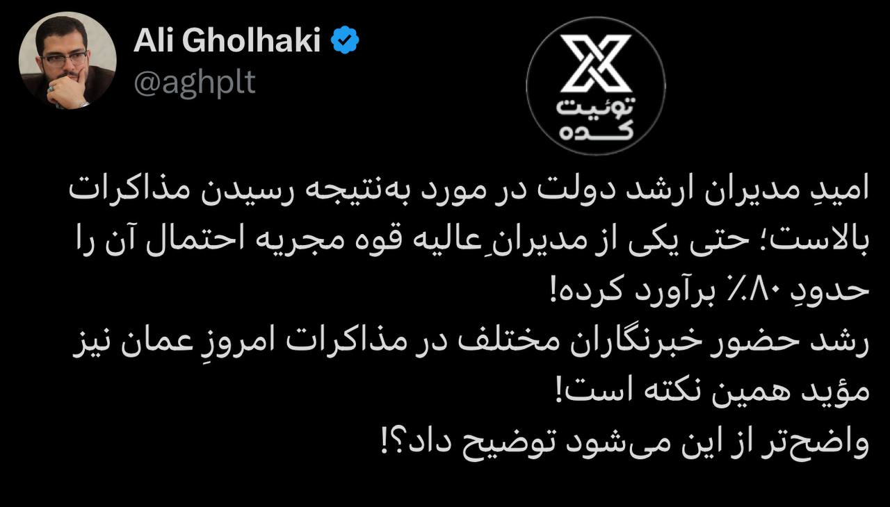 علی قلهکی فعال رسانه ای نزدیک به دولت بعداز نشست دور سوم مذاکرات ایران و آمریکا که بر خلاف دو نشست قبلی، اخبار مثبت خاصی نداشت و حرف از سخت شدن مذاکرات و تشدید اختلافات زده شد، در توییتی نوشت: امیدِ مدیران ارشد دولت در مورد به نتیجه رسیدن...
